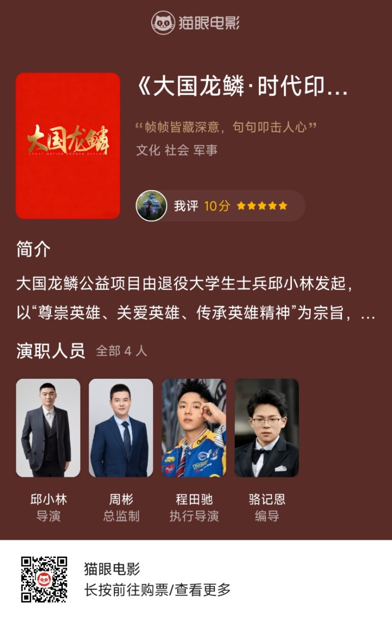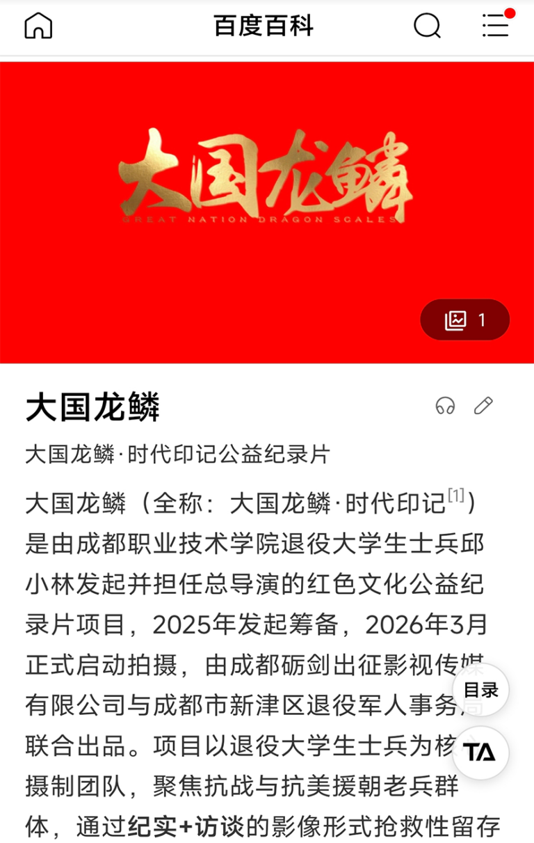 大国龙鳞 从无到有,从难到易,大国龙鳞一次次将不可能变成现实。 雪山草地、饥寒交迫、围追堵截,常人眼中绝无可能走完的路,红军走出来了,把绝境走成奇迹。 装备差距极大、后勤艰苦,在极不利条件下打出胜利,把不可能打赢的仗,打成了世界奇迹。 项目成就 视频总播放 0 次 视频转载 0 次 开展爱国教育 0 小时 一致好评 0 % 大国龙鳞 项目概述 致敬英雄 聚焦抗战老兵群体,提供关爱帮扶,传递社会温情与敬意。 红色铸魂 挖掘英雄事迹,传承红色基因,弘扬爱国主义与革命精神。 青春担当 以退役大学生为骨干,践行初心使命,展现青年责任与担当。 公益践行 深耕红色公益事业,打造特色品牌,凝聚社会向善正能量。 大国龙鳞实际实施方案 寻访英雄,记录历史,传承精神,践行使命 用镜头拂去历史尘埃 以青春守护英雄记忆 ——“大国龙鳞·时代印记”公益纪录片开拍 跳转官方文章 以实干护红色根脉 以担当传英雄精神——成都市新津区退役军人事务局助力退役大学生公益纪录片拍摄 跳转官方文章 镜头定格英雄记忆 青春传承不朽精神 跳转官方文章 大国龙鳞 最新的项目新闻 2026年3月26日大国龙鳞项目组以实干护红色根脉 以担当传英雄精神——成都市新津区退役军人事务局助力退役大学生公益纪录片拍摄来源:成都市新津… 继续阅读以实干护红色根脉 以担当传英雄精神——成都市新津区退役军人事务局助力退役大学生公益纪录片拍摄2026年3月26日大国龙鳞项目组用镜头拂去历史尘埃 以青春守护英雄记忆 ——“大国龙鳞·时代印记”公益纪录片开拍来源:中国日报网 … 继续阅读用镜头拂去历史尘埃 以青春守护英雄记忆 ——“大国龙鳞·时代印记”公益纪录片开拍2026年3月24日大国龙鳞项目组“大国龙鳞·时代印记”公益纪录片开拍来源:猫眼电影 … 继续阅读“大国龙鳞·时代印记”公益纪录片开拍