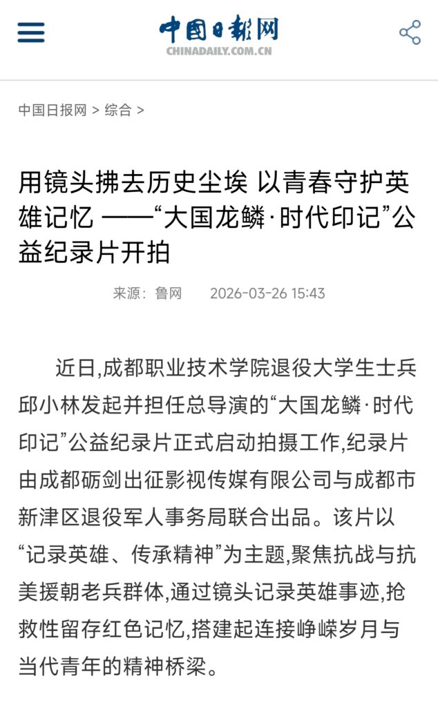 2026年3月26日大国龙鳞项目组用镜头拂去历史尘埃 以青春守护英雄记忆 ——“大国龙鳞·时代印记”公益纪录片开拍来源:中国日报网 … 继续阅读用镜头拂去历史尘埃 以青春守护英雄记忆 ——“大国龙鳞·时代印记”公益纪录片开拍